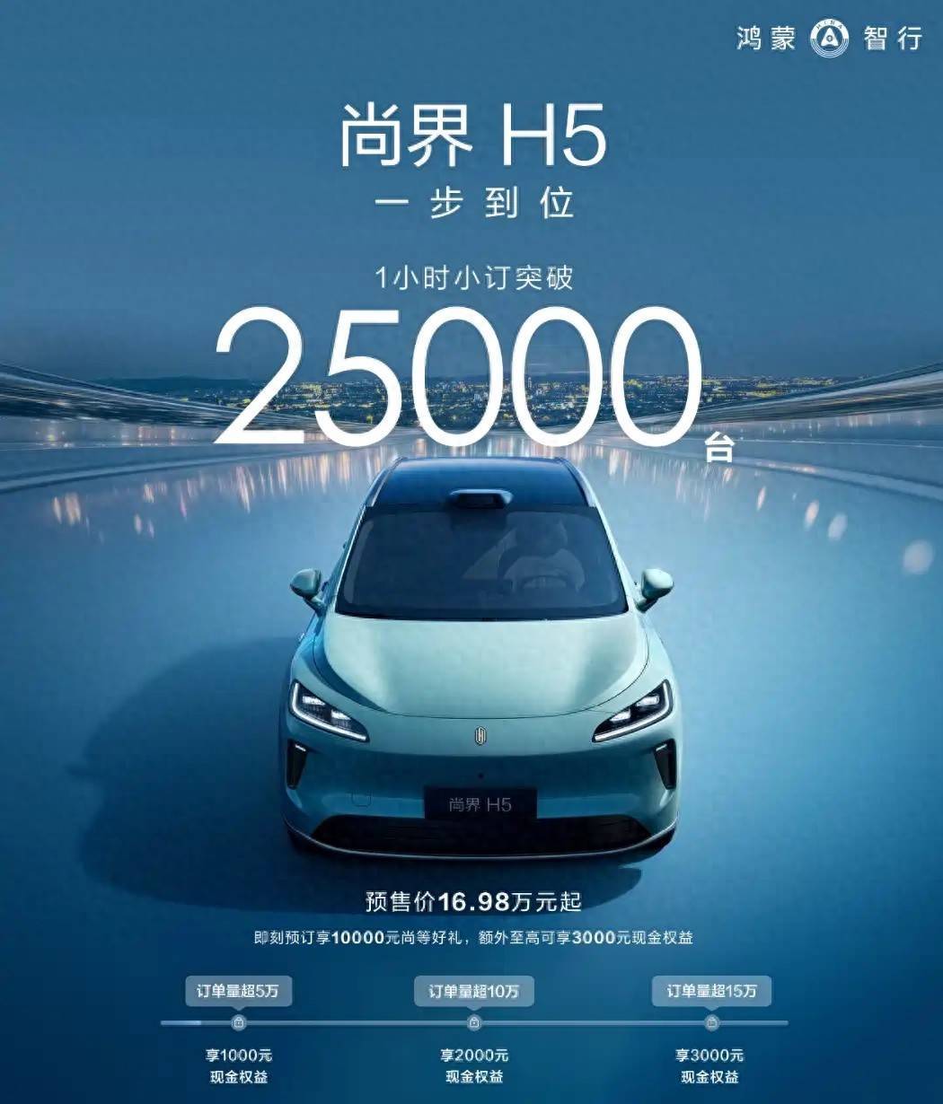 前面已经说了,华为鸿蒙智行旗下车型的售价都在20万以上,可是尚界H5的预售价却为16.98-20.98万元,尚界这“第五界”明显不按套路出牌,它也成了鸿蒙智行唯一的预售价在20万以内的车型,也是华为最便宜的新车。该车在开启预售的1小时内,小订就突破了2.5万台,难道尚界H5真的20万以内无对手?